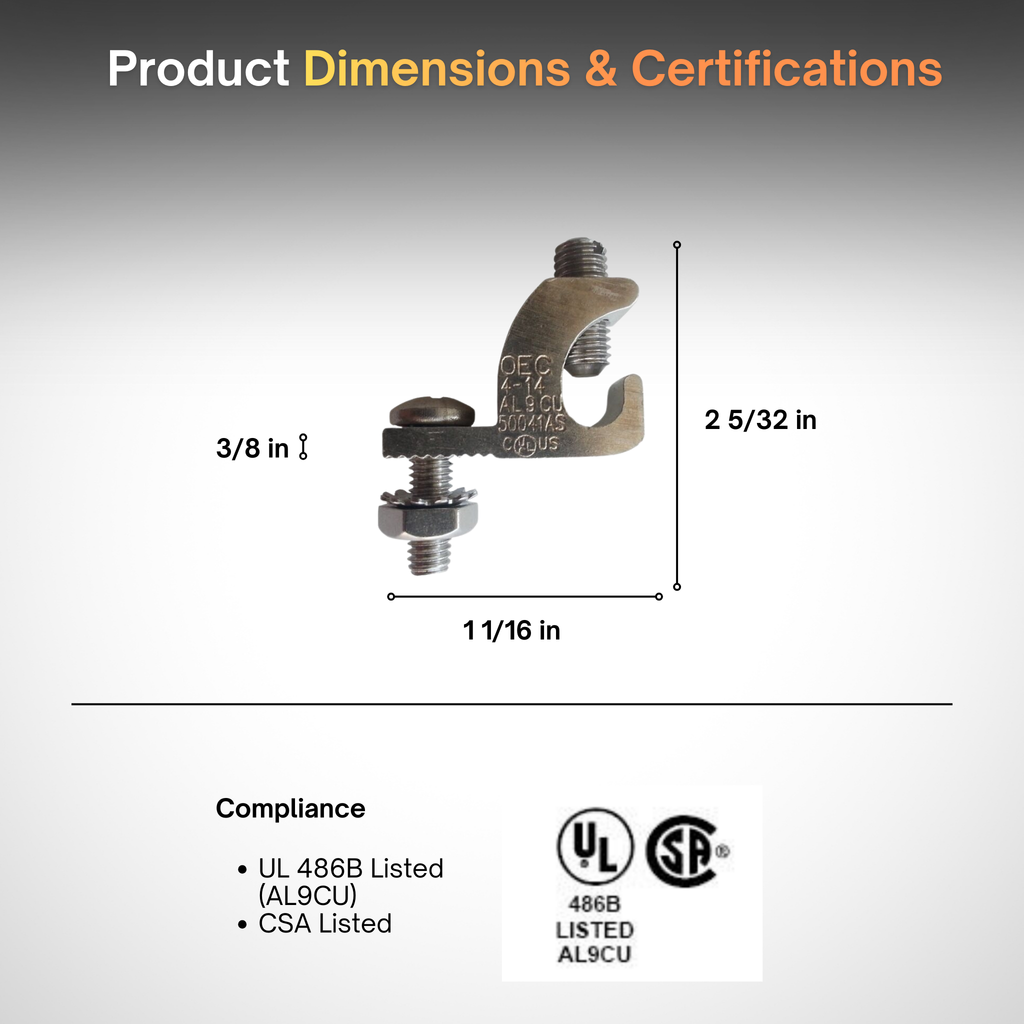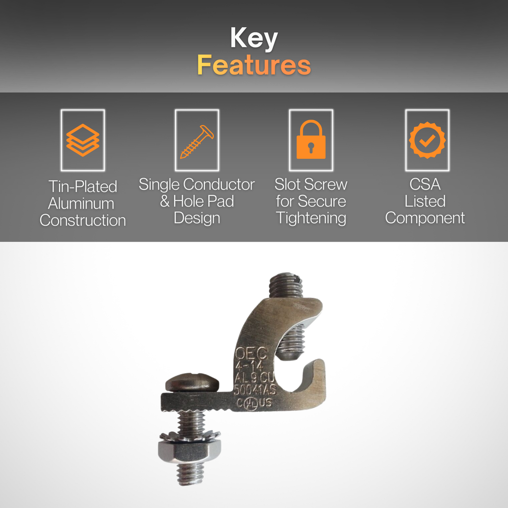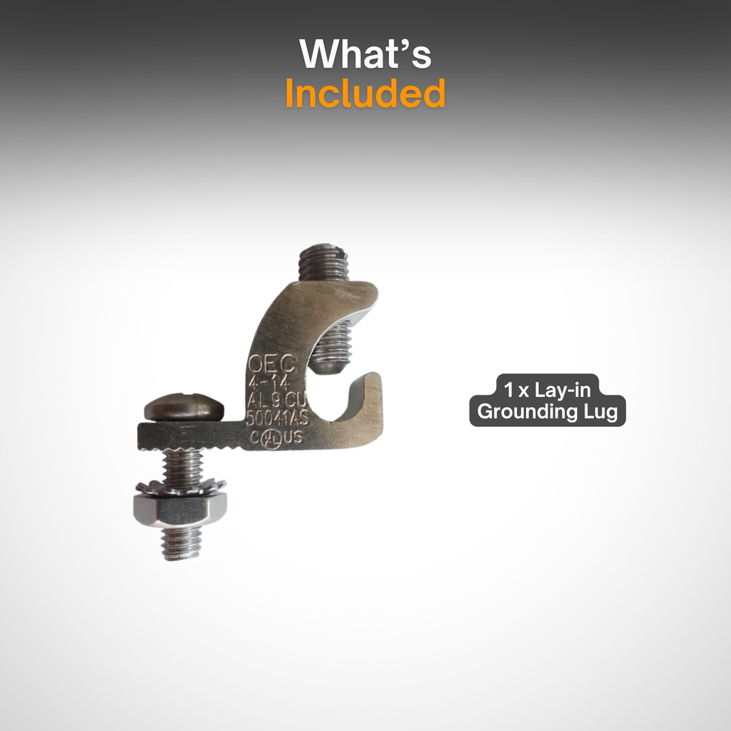 Lay-In Grounding Lug, Tin-Plated Aluminum, 14–4 AWG, UL 486B AL9CU, Single Hole Electrical Ground Lug for Copper & Aluminum Conductors